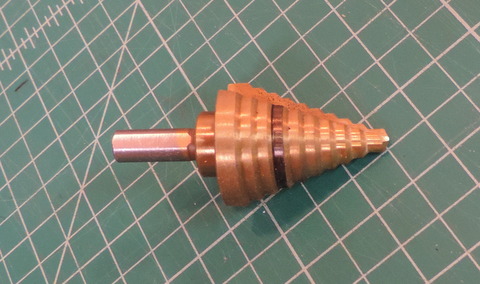 Above: I put a block of wood under the wheel because the Step Drill extends through the wheel body. (yes, I've drilled into the table of my drill press. avoid that if you can - it dulls the drill bits!) Right: The swarf will obscure your progress - Turn off the Drill, wait for it to stop spinning, and clean it off! Then continue... | |