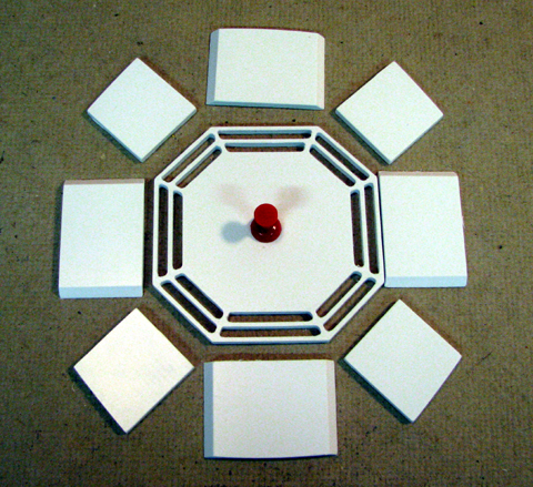 I was just about finished adding a set to tabs to the top edges of each of the corner pieces and matching cuts in the top edges of the top/bottom and left/right side parts when Stephen posted a flat pack octagon port design on astromech.net. He solved the problem I had in the first design rather elegantly. I modified his version by adding tabs and slots to the outer box. It makes it easier to glue the box together. Here's how the design is developed using Alibre Design's 3d CAD software